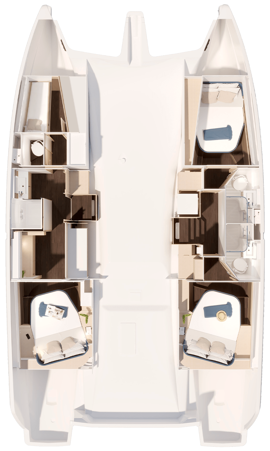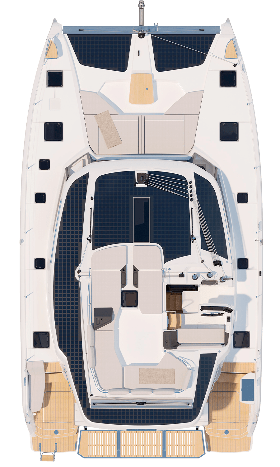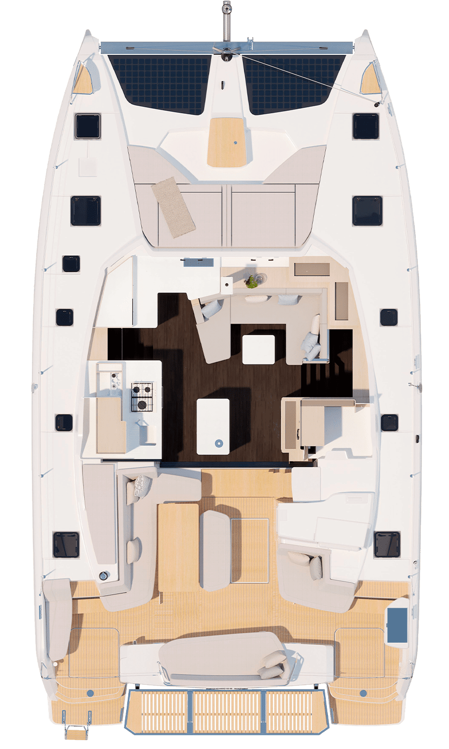 The discreet coachroof (albeit wider), the subtly inverted deck sheer, hull portholes highlighted by a stripe, a discreet chine above the waterline that’s extended as much as possible, and a sleek rig are all elements that guarantee not only good performance, but also elegance and balance. From the very first tack you make, harmony is the natural order of the day: this perfectly optimised catamaran offers generous relaxation space in the cockpit, on the flybridge and forward of the coachroof. When it comes to sail manoeuvring, the deck layout remains faithful to the double manoeuvring/helm station that’s become such a favourite among users. Like all new Fountaine Pajot models, the FP44 is available with our ODSea+ electric drivetrain and up to 2 000W of solar panels.