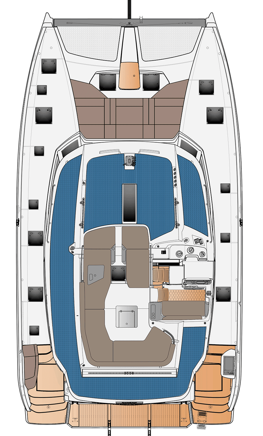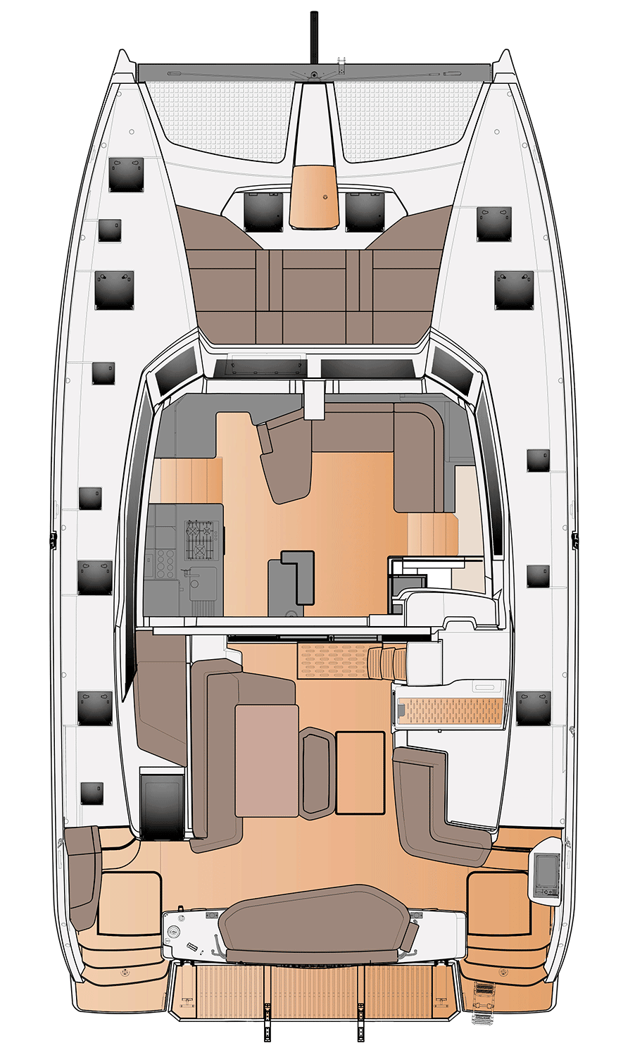 At nearly 15 meters long, the FP48 is surprising by her efficient layout. The living space is all about ergonomic innovation. The saloon and cockpit connect through a wide 3-meter sliding door, opening up the whole area to create one big space. At the back you will find a relaxing area adjacent to the water: relax on the chaise longue in total privacy as you watch the wake, or hang out with the others on the large cockpit bench and cosy seats. Prefer a higher point of view? Make the most of the view from the rooftop sun loungers or head to the front deck, fully fitted with optional loungers. The only challenge will be having to choose…