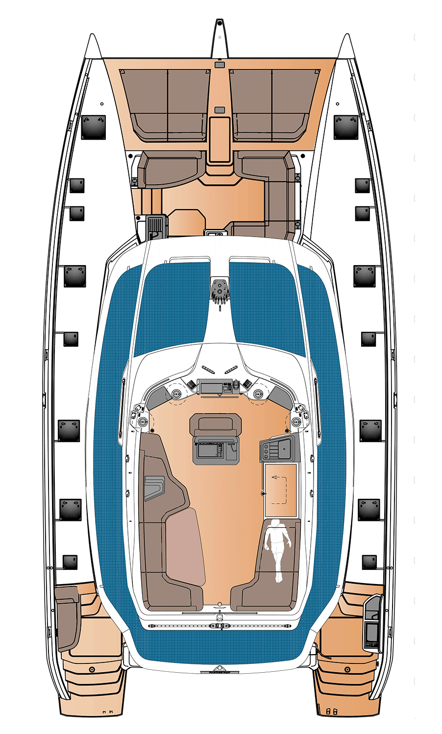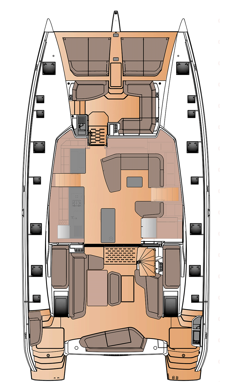 The FP55 is the first cruising catamaran in our range to feature a direct access door to the forward cockpit unveiling a whole new deck layout where fresh air and guests flow. From the bow, where the wake draws you in, to the stern, where the plancha brings everyone together, everyone gets together to share their impressions.